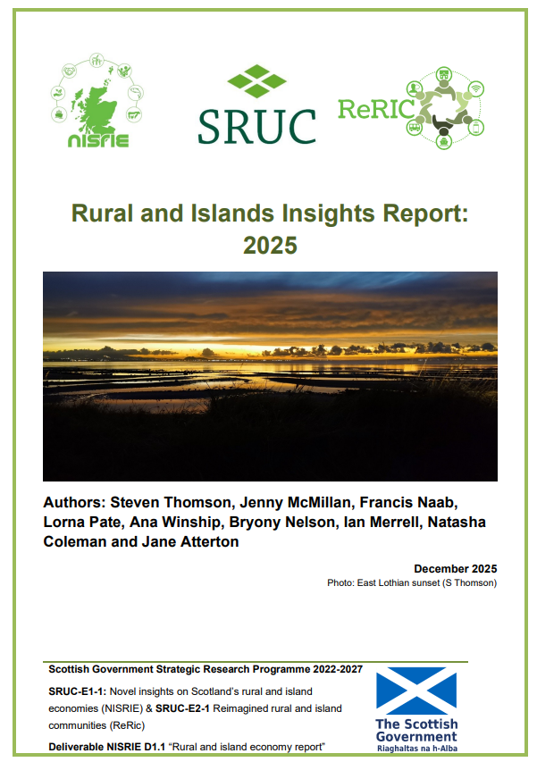 The purpose of this 2025 Rural and Islands Insights Report is to provide new data insights, evidence and analysis on Scotland’s rural and island communities, focusing on demographic change, poverty and inequality, transport and connectivity, housing energy efficiency, care provision for children and older people, digital infrastructure, and agricultural transformation. This second Insights report follows on from our 2023 Insights report, funded through the ‘Novel insights on Scotland’s rural and island economies' (NISRIE) and ‘Reimagined Policy Futures: Shaping sustainable, inclusive and just rural and island communities in Scotland’ (ReRIC) projects within Theme E: Rural Futures of the Scottish Government’s Strategic Research Programme (2022–2027).