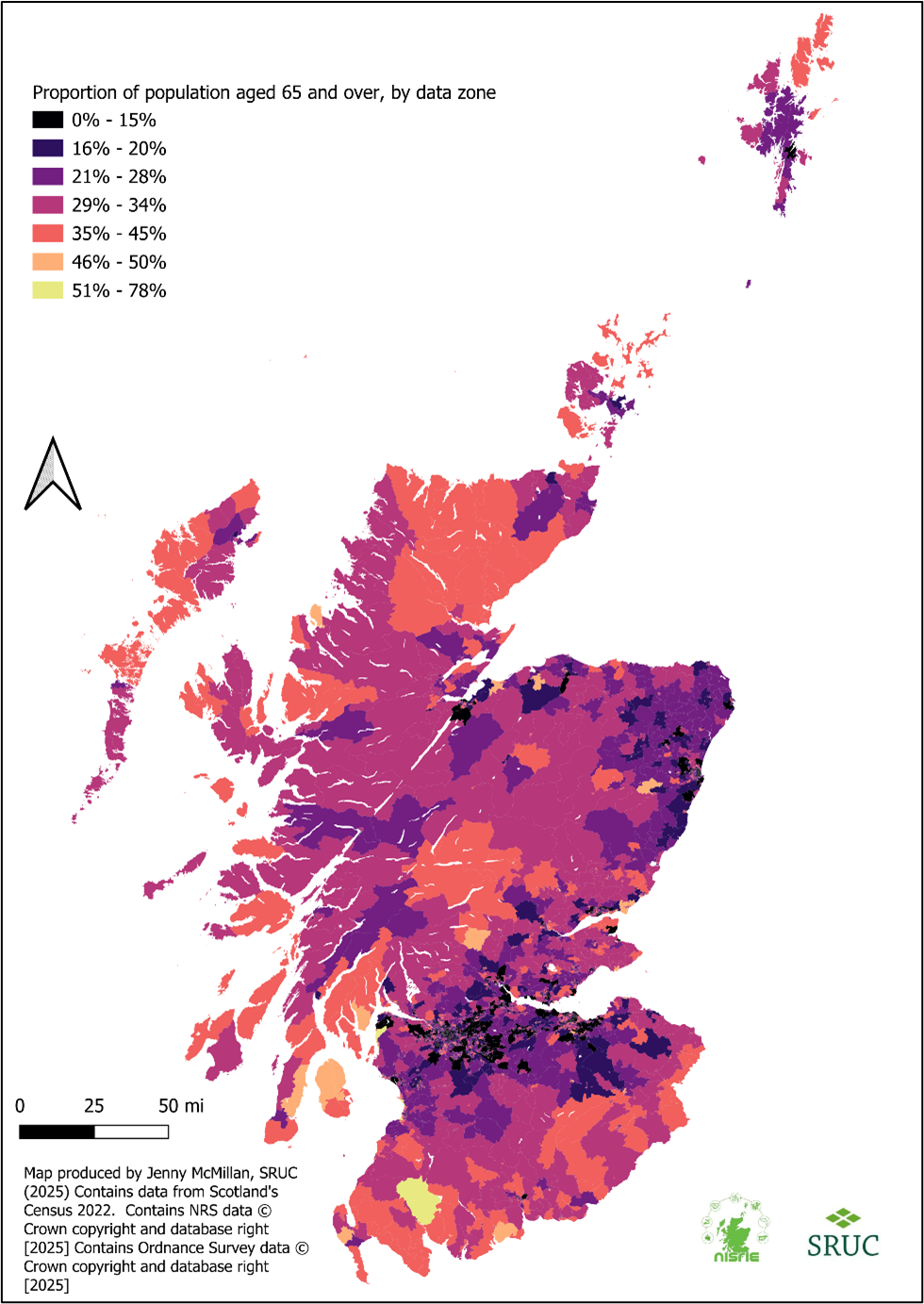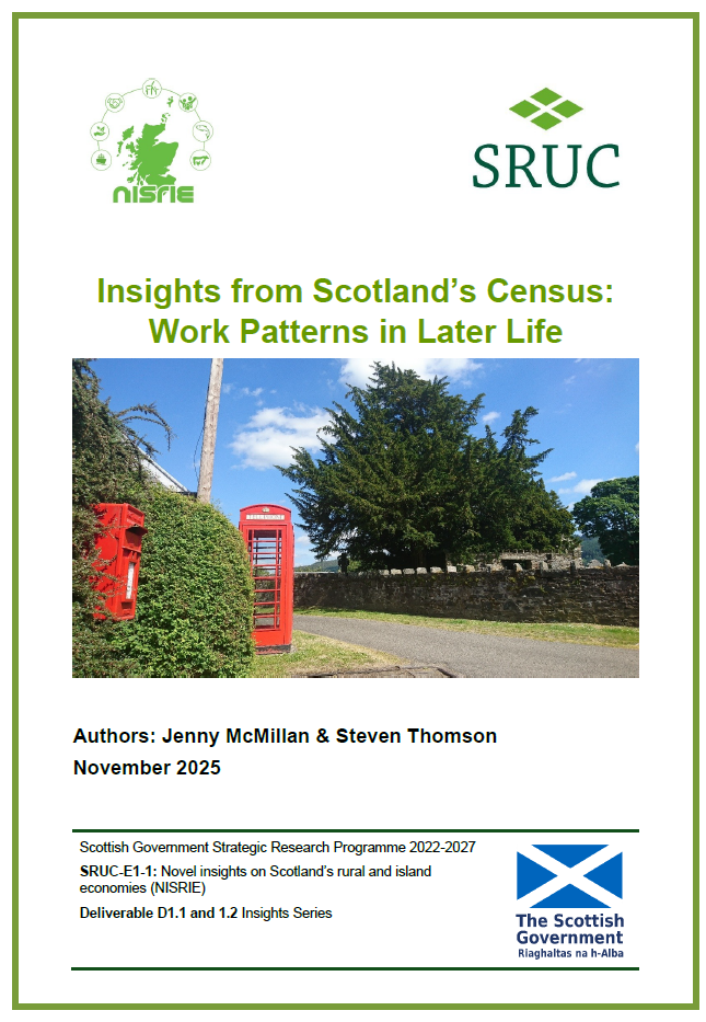 This report aims to provide insights into the levels of economic activity in Scotland’s 65 years old and over (65+) population, the type of activity and the sectors they are engaged in using Scotland's Population Census data. This report is part of the Novel Insights on Scotland’s Rural and Island Economies (NISRIE) project as part of the Scottish Government's Environment, Natural Resources and Agriculture strategic research programme 2022-27. The report can be downloaded directly from the link at the bottom of this page.