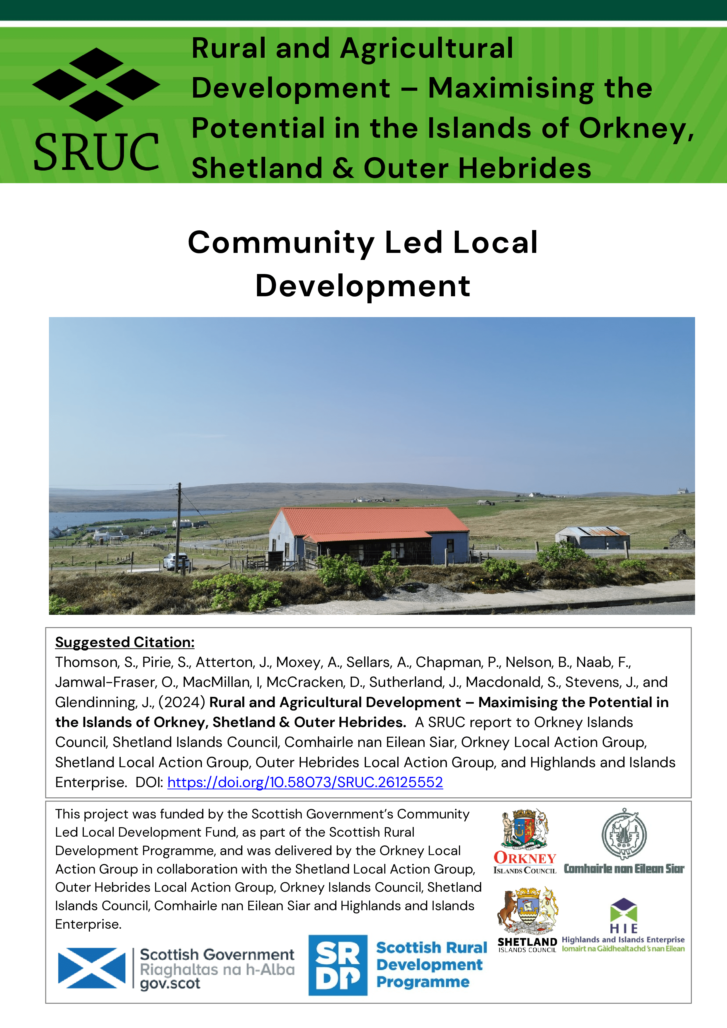 The Community Led Local Development (CLLD) section of the SRUC report Rural and Agricultural Development: Maximising the potential in the islands of Orkney, Shetland and Outer Hebrides can be downloaded as a stand alone document from the link below. The data for this section of the report was collected through a desk-based review of key documents as well as individual and group interviews with stakeholders across all three island groups. A selection of the points raised in this section of the report includes: